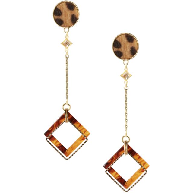 レオパードフェイクハラコ&べっ甲スクエア チェーンイヤリング